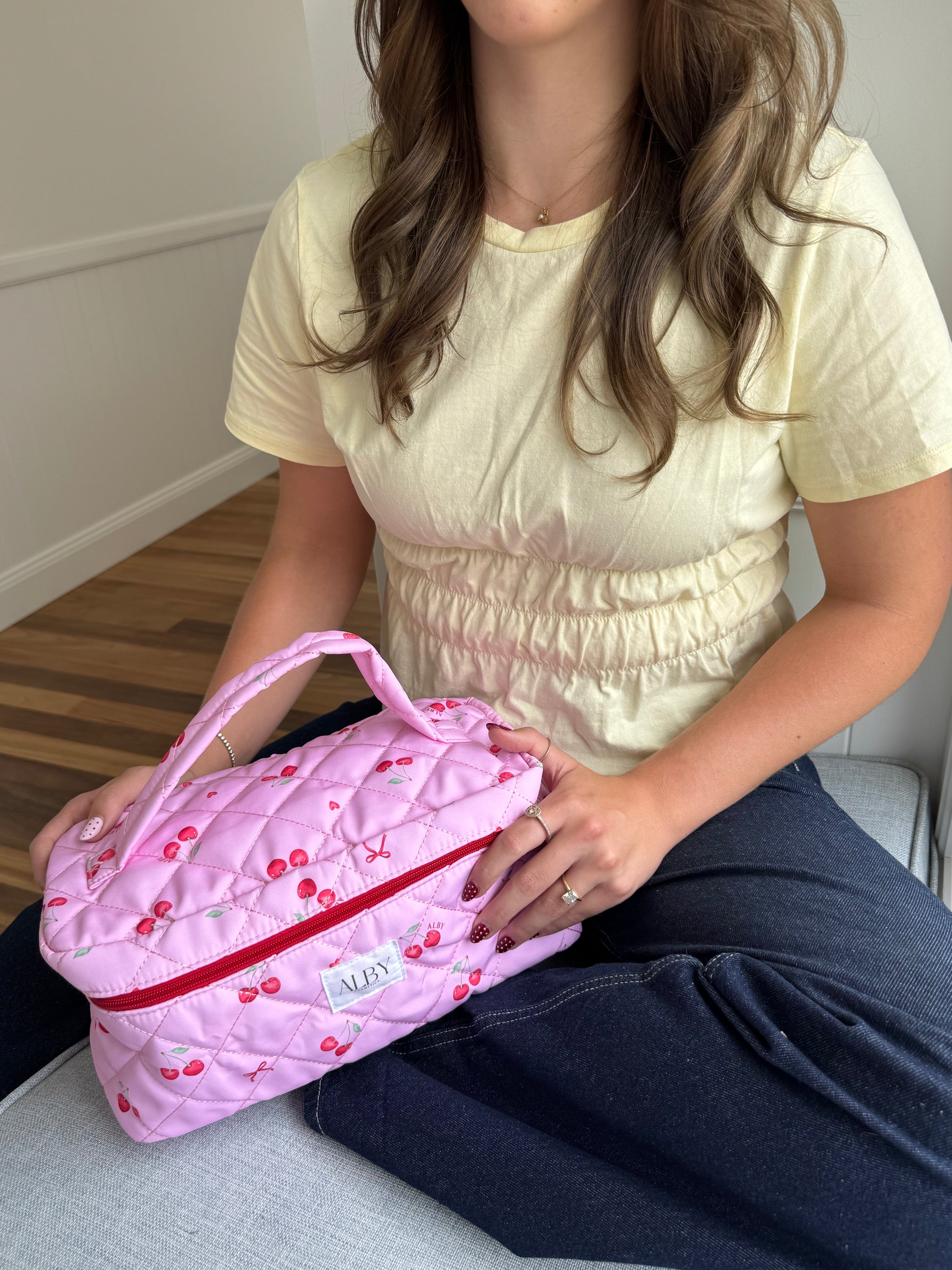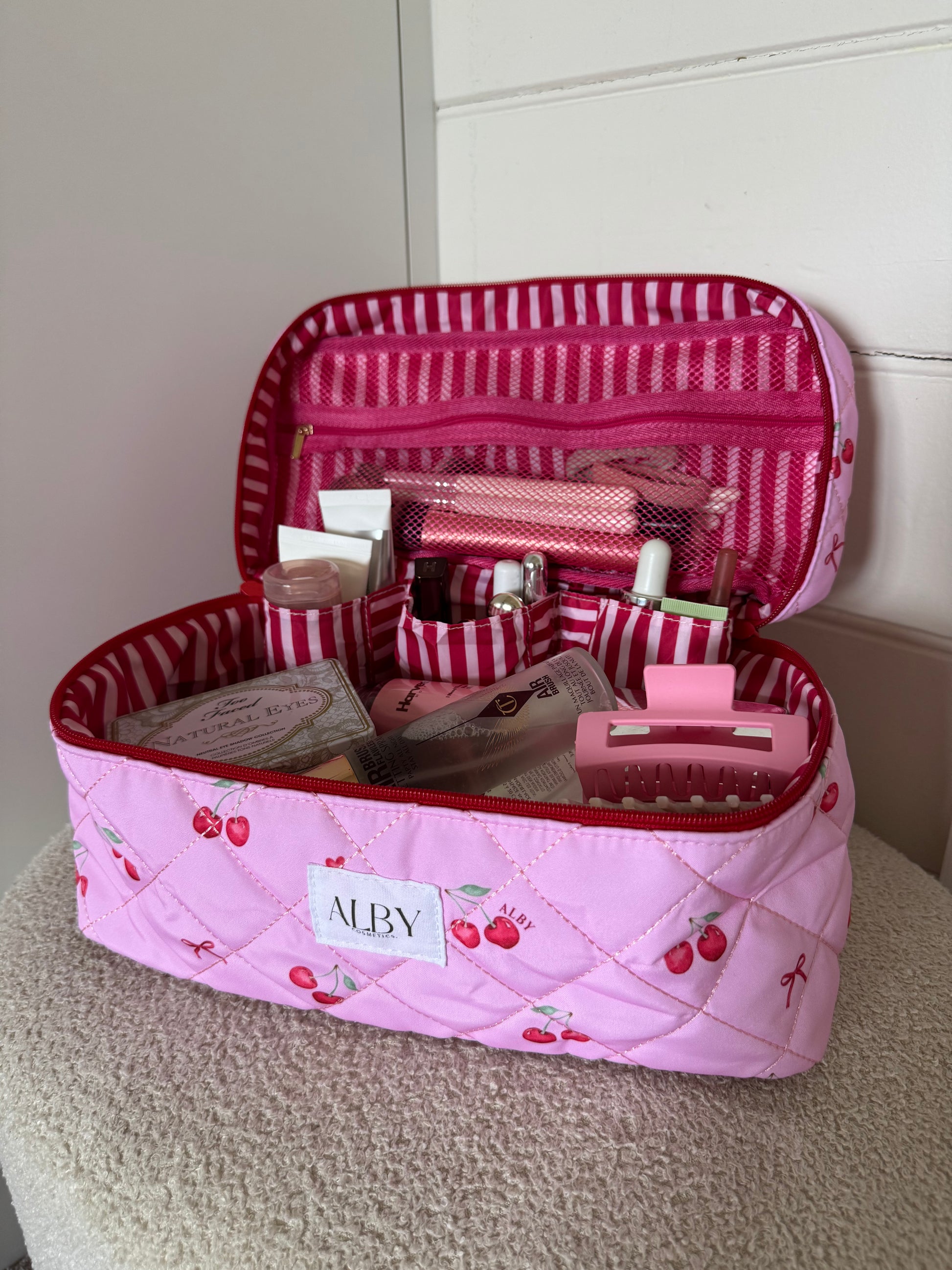 The entire bag is fully washable for easy care, with a wipeable inner lining to clean up product spills effortlessly. A sturdy carry handle adds convenience, making her the ideal companion for travel or daily use.